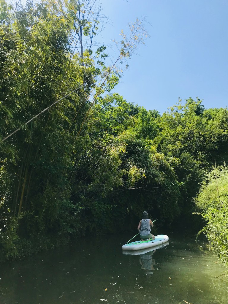 Cela faisait longtemps que j’avais promis à Julie un baptême de stand up paddle. Versaillaise d’origine, Montrougienne d’adoption, elle n’aurait qu’à prendre, en sortant du travail, la ligne 8 du métro. Direction Créteil-Université, où je l’attendrais pour lui faire découvrir un endroit hors du temps, parfaitement idéal pour faire du paddle près de Paris… Car c’est précisément ce que sont, sur les bords de Marne, les îles de Créteil. Si proches et si loin de la ville et de son tumulte. Si verdoyantes. Si silencieuses aussi. Peuplées de villas modestes ou opulentes, de jardins immenses et minuscules, et aussi de quelques propriétés autrefois ravissantes et aujourd’hui défraîchies. Sans parler du nombre incalculable de poissons, d’oiseaux et d’animaux sauvages qui y ont élu domicile.