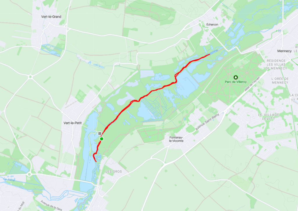 Ne vous aventurez pas sur les étangs qui bordent la rivière : l’accès y est interdit. Le courant est très faible, mais un peu moins d’un kilomètre après le départ, un arbre barre cette fois totalement le passage, et empêche d’aller plus loin. Demi-tour, direction Mennecy, pour environ 4 kilomètres dans le sens du courant cette fois.